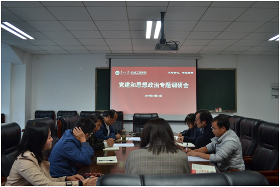 機(jī)械工程學(xué)院網(wǎng)訊(報(bào)道鄒醒佳|攝影楊誠(chéng) 儂玉昌) 為認(rèn)真落實(shí)中央、省委和貴州大學(xué)黨委的決策部署,扎實(shí)開(kāi)展學(xué)院“不忘初心、牢記使命”題教育工作,根據(jù)機(jī)械工程學(xué)院黨委班子成員開(kāi)展主題教育調(diào)研方案,10月14日,機(jī)械工程學(xué)院黨委書(shū)記安明剛在機(jī)械樓522會(huì)議室召開(kāi)黨建和思想政治專題調(diào)研會(huì),圍繞“堅(jiān)定理想信念,牢記初心使命”主題,全面了解學(xué)院黨建和思想政治工作情況。我院黨委副書(shū)記代祥社、副院長(zhǎng)楊勤及各支部書(shū)記、學(xué)生黨員代表、教職工黨員代表參加了會(huì)議。