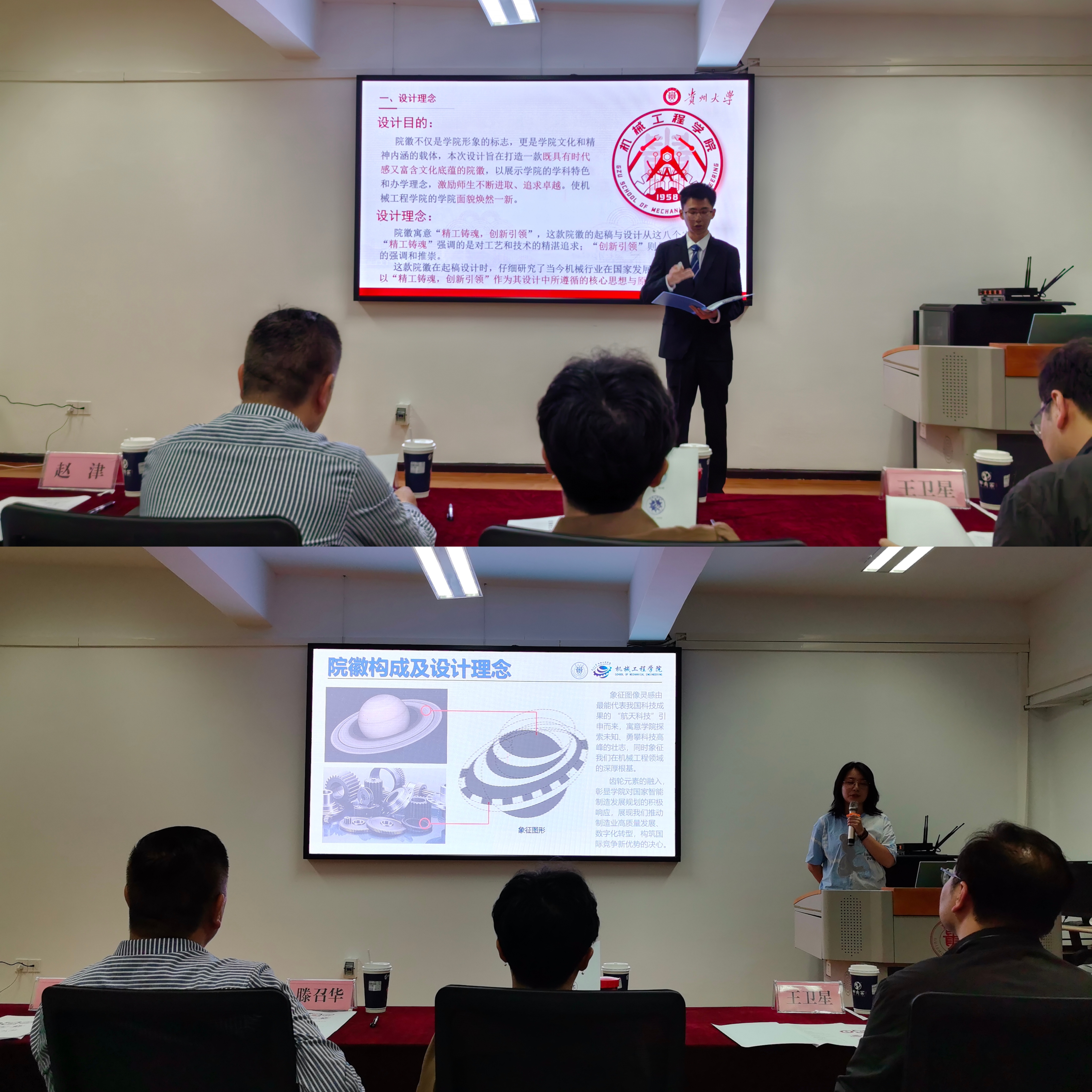 經(jīng)過(guò)初評(píng)、師生投票,進(jìn)入決賽的10個(gè)院徽作品創(chuàng)作者依次展示他們獨(dú)特的設(shè)計(jì)理念和創(chuàng)意,評(píng)委依次打分。