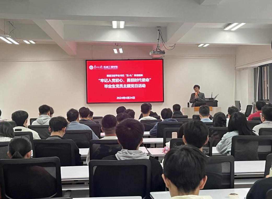 根據(jù)學(xué)院黨委統(tǒng)一安排部署,2024年4月24日學(xué)院研究生科組織即將畢業(yè)研究生黨員開(kāi)展“重溫習(xí)近平總書(shū)記‘五·九’講話精神,牢記入黨初心,勇?lián)鷷r(shí)代使命”主題黨日活動(dòng),在畢業(yè)研究生黨員中深入開(kāi)展“畢業(yè)前最后一堂黨課”活動(dòng)。學(xué)院正處級(jí)組織員董蔚然、研究生黨建負(fù)責(zé)人田森老師、研究生兼職輔導(dǎo)員肖祥美老師、機(jī)械工程學(xué)院和現(xiàn)代制造技術(shù)教育部重點(diǎn)實(shí)驗(yàn)室2024屆全體畢業(yè)研究生黨員參加活動(dòng)。