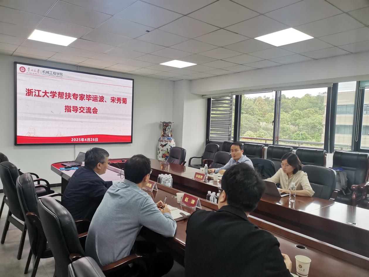 為深入貫徹落實省委省政府關(guān)于深化東西部協(xié)作和新時代高校對口幫扶工作的重要指示精神,2025年4月26日下午,浙江大學機械工程學院對口幫扶專家畢運波教授、宋秀菊研究員一行赴貴州大學機械工程學院開展指導交流?;顒佑少F州大學機械工程學院黨委書記趙津主持,浙江大學幫扶專家組組長、國家級人才稱號獲得者馮毅雄及學院青年教師代表吳家柱、汪???、杜昊、漆令飛、陳躍威等10余人參與座談交流。