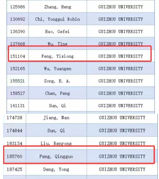 2025年9月19日,美國(guó)斯坦福大學(xué)(Stanford University)與愛(ài)思唯爾(Elsevier)聯(lián)合發(fā)布了第八版《全球前2%頂尖科學(xué)家榜單2025》(World’s Top 2% Scientists 2025)。該榜單依托Scopus數(shù)據(jù)庫(kù)的引用數(shù)據(jù)進(jìn)行系統(tǒng)分析,從全球近700萬(wàn)名科學(xué)家中,依據(jù)“生涯影響力”和“年度影響力”兩項(xiàng)指標(biāo),遴選出世界排名前2%的頂尖科學(xué)家。其中,中國(guó)有12374位學(xué)者入選“終身榜”,31685位學(xué)者入選 “2025 年度榜”。我院馮毅雄教授、彭慶國(guó)副教授亦榜上有名,成功入選2025年全球前2%頂尖科學(xué)家“年度影響力”榜單,如圖1所示。